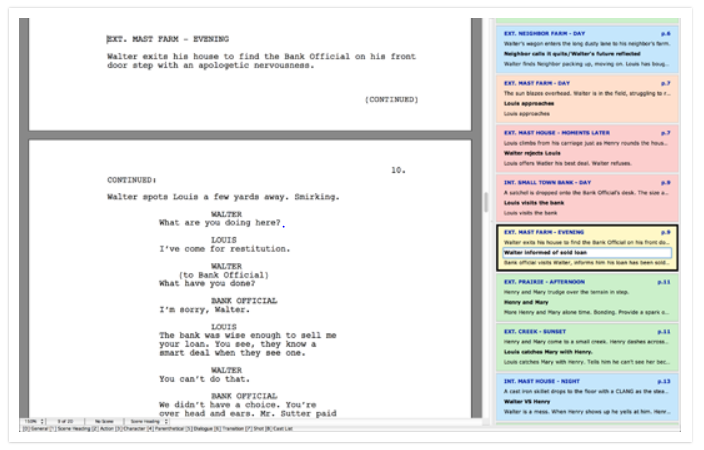 Final Draft has double-sided cards that display the script’s scene on one side and the summary on the other. The summary view allows you to enter text directly into the index card – plot points, notes, sequence or act markers, comments, locations, blocking – anything you need to build and organize your story.
